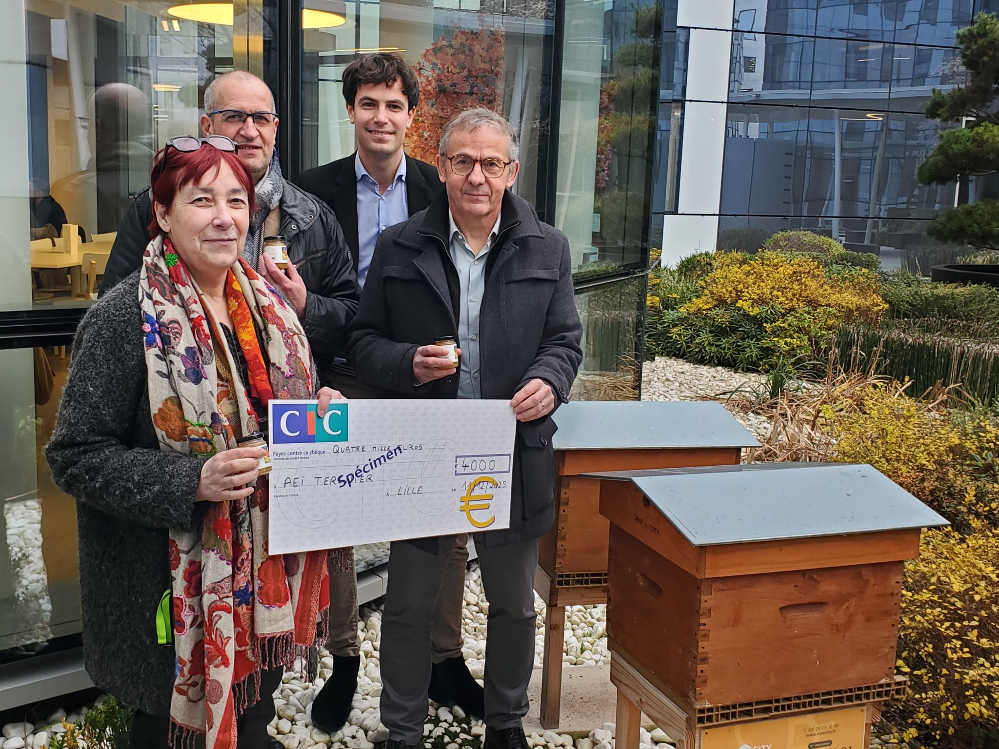 Ce montant est le fruit de la récolte du miel des ruches disposées dans le jardin du Siège Social du CIC de Lille.